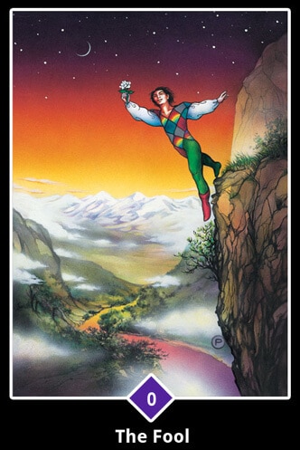 Moment to moment, and with every step, the Fool leaves the past behind. He carries nothing more than his purity, innocence and trust, symbolized by the white rose in his hand. The pattern on his waistcoat contains the colors of all four elements of the tarot, indicating that he is in harmony with all that surrounds him. His intuition is functioning at its peak. At this moment the Fool has the support of the universe to make this jump into the unknown. Adventures await him in the river of life.